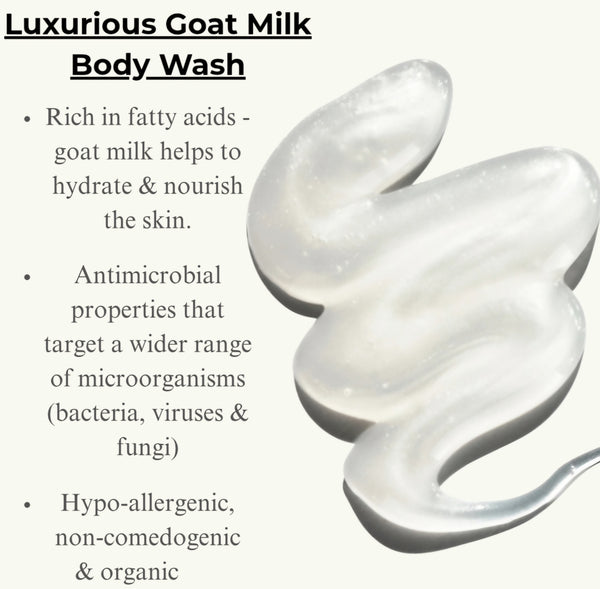 Premium Ingredients: water, glycerin, potassium cocoate, potassium olivate, oleic acid, glycerin, pure goat milk, pure organic essential oils (unless unscented)